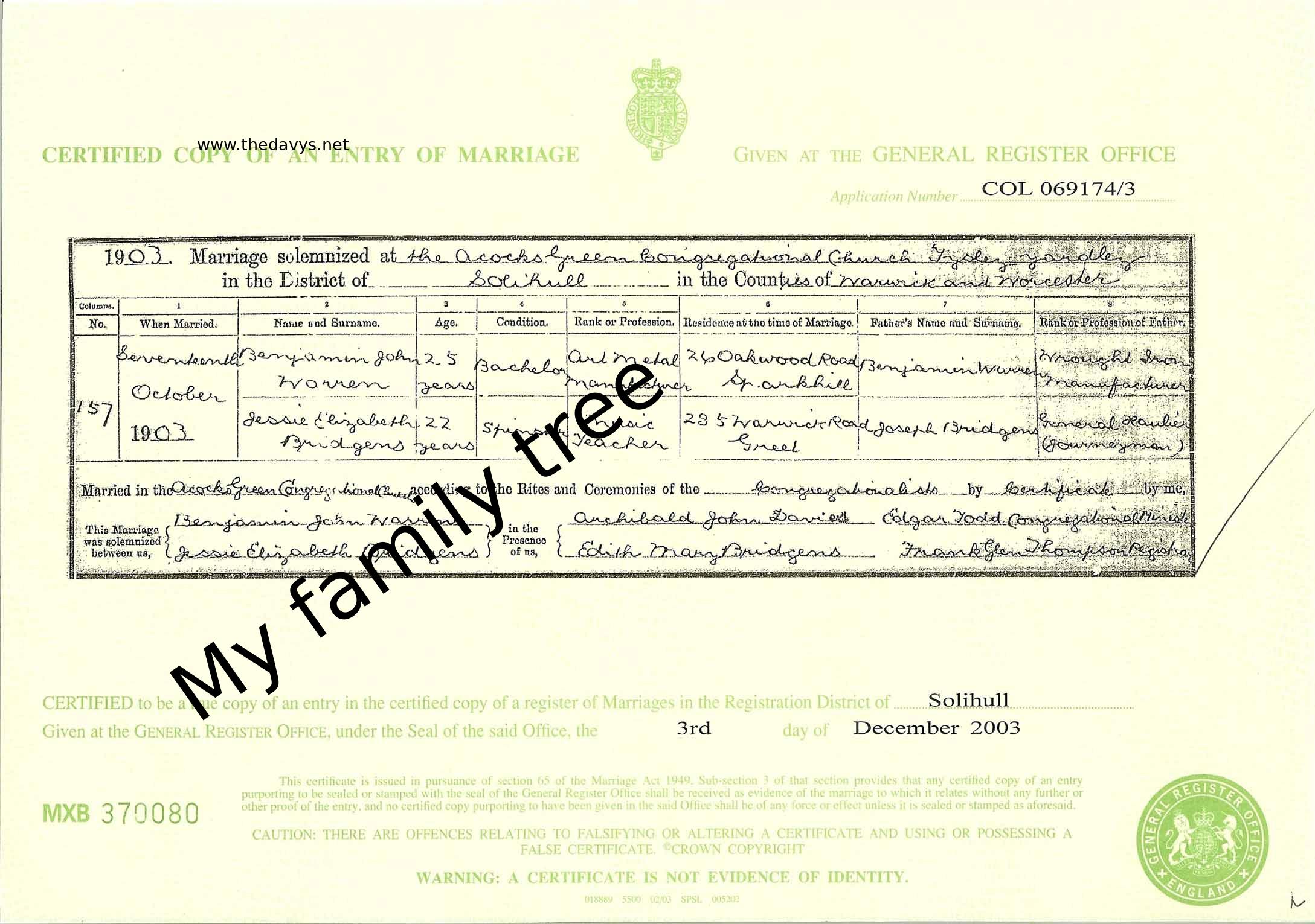 | Marriage | Benjamin John WARREN — View this family 17 October 1903 Husband: 25 years Wife: 22 years Address: Acocks Green, Congregational Church, Tupsley, Solihull, Warwick & Worcester, England Source: Marriage Certificate Source: Elsbeth Tree |
