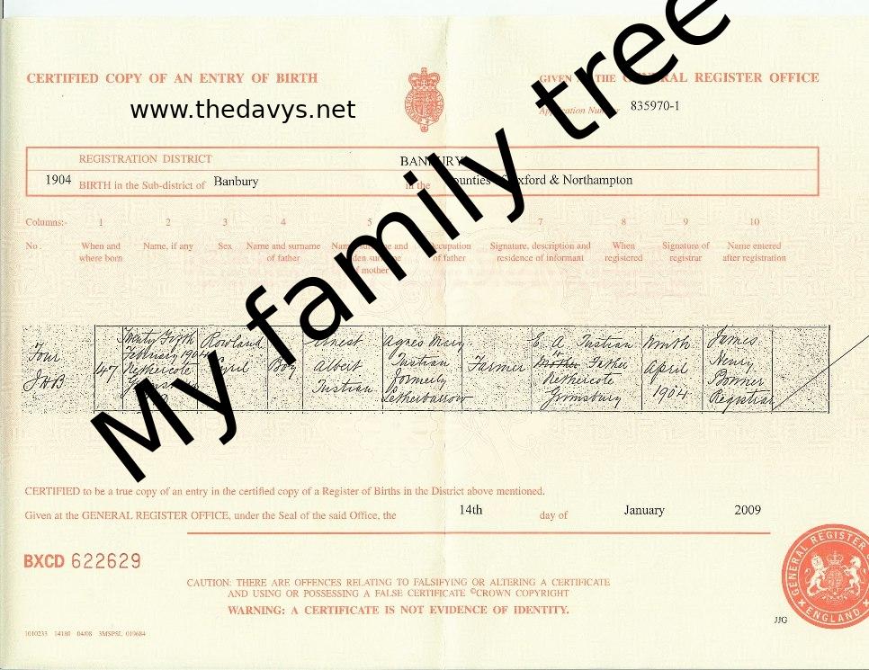 | Birth of a son #4 | Roland Cyril TUSTIAN 25 February 1904 Address: Nethercote, Grimsbury, Banbury, Oxfordshire, England Source: Birth Certificate |