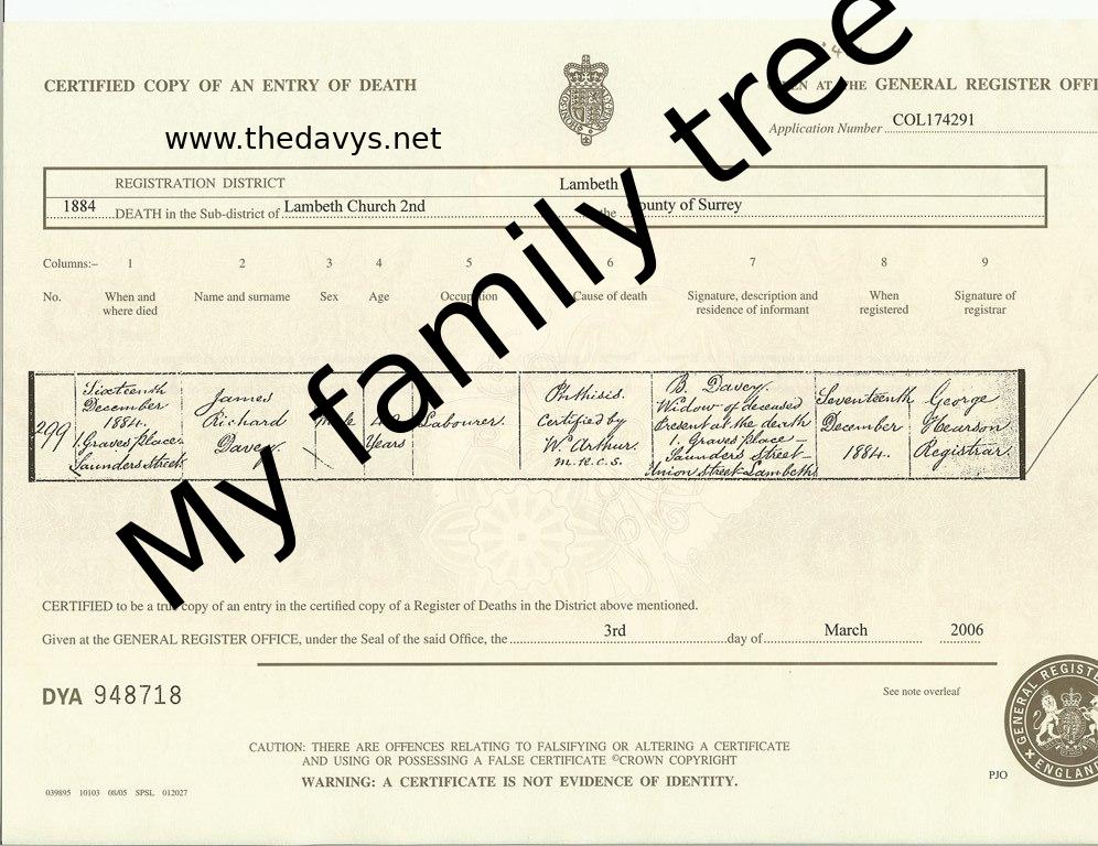 | Death | 16 December 1884 Age: 40 years Address: 1 Graves Place, Saunders Street, Union Street, Lambeth, Surrey, England Cause of death: Phthisis / Consumption (TB) Source: Death Certificate Date of entry in original source: 16 December 1884 Note: James Richard DavEy