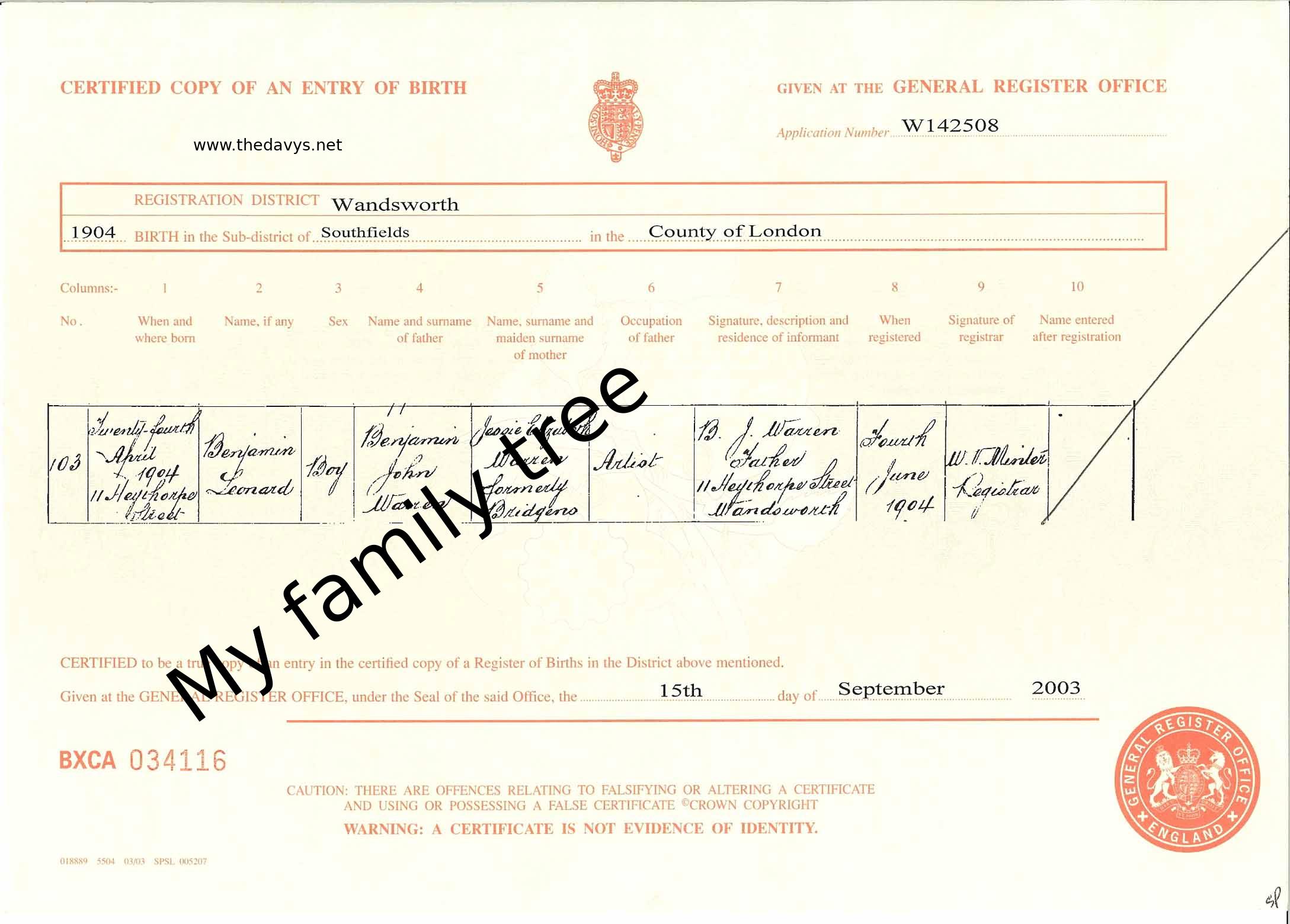 Birth Certificate - Benjamin Warren